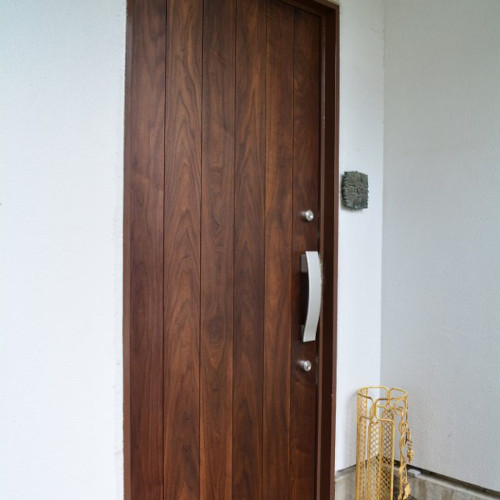 ウォールナットの無垢材を贅沢に使用した玄関ドア。