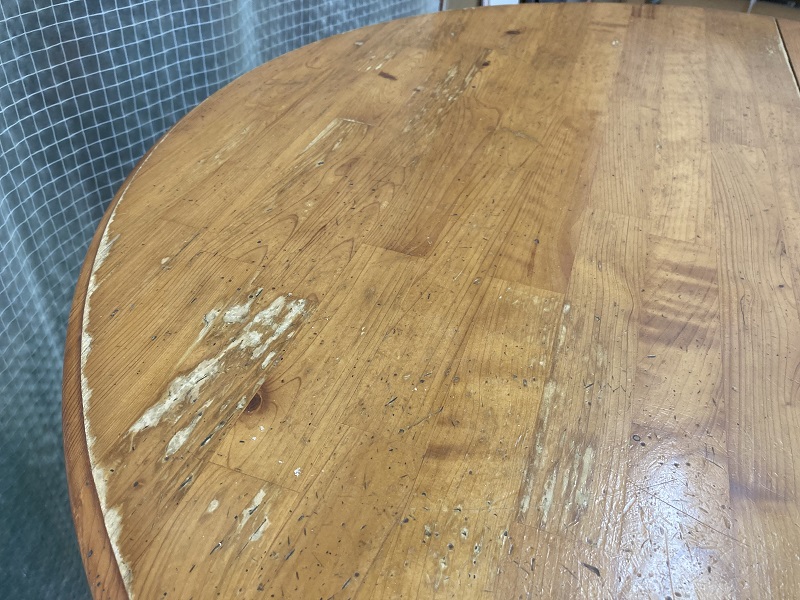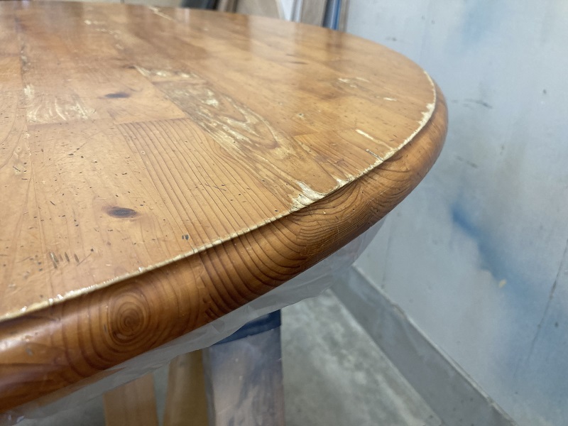 木が柔らかいパイン材で作られているため、深い傷を負いやすく塗装もかなり剥がれて傷みがひどい状態でした。