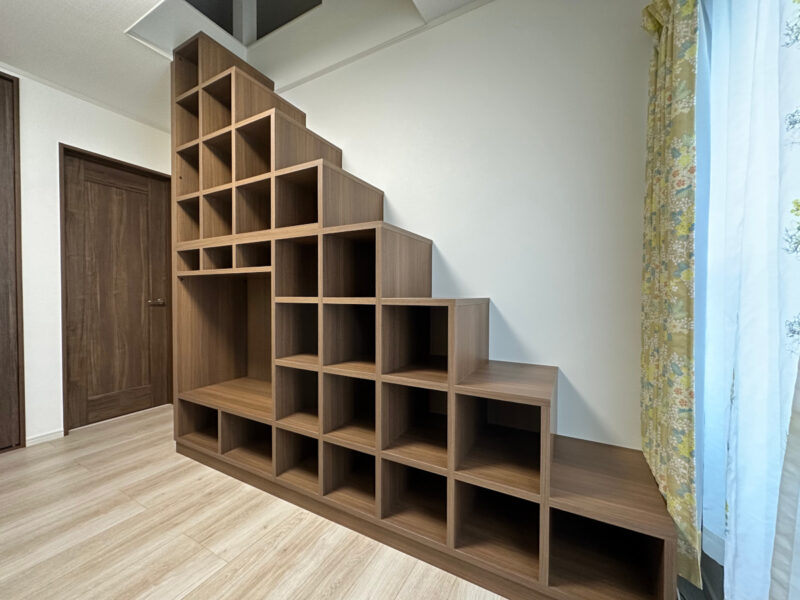 階段の段差に合わせて収納ボックスを積み重ねたような構造になっており、ロフトへと自然につながるデザインになっています。