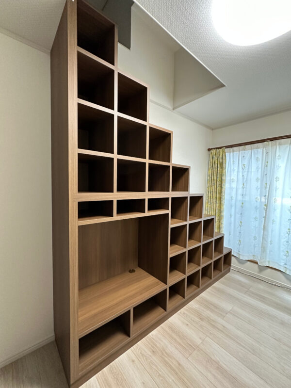 階段状に並ぶ収納のフォルムは、一般的な家具にはない立体的なデザインです。
