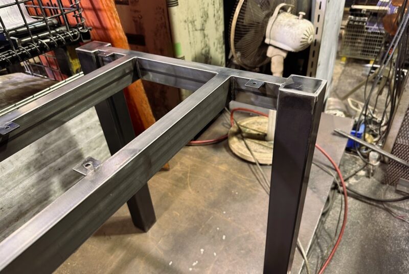 脚には、マットブラックに仕上げたスチール製の特注脚を組み合わせ。重厚感ある木の天板と、直線的で軽やかな鉄脚とのコントラストが、全体にほどよいカジュアルさとモダンな印象を添えています。