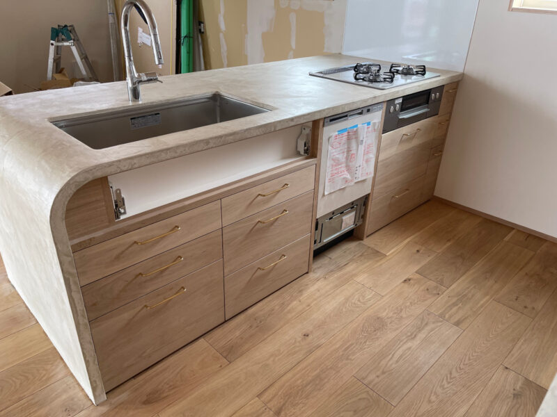 3.オーダーキッチン(側面天板一体化+無垢材扉)