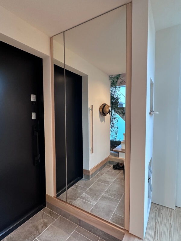 大型ミラー付きの下駄箱は、玄関を広く見せる効果も。