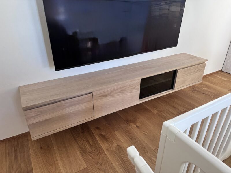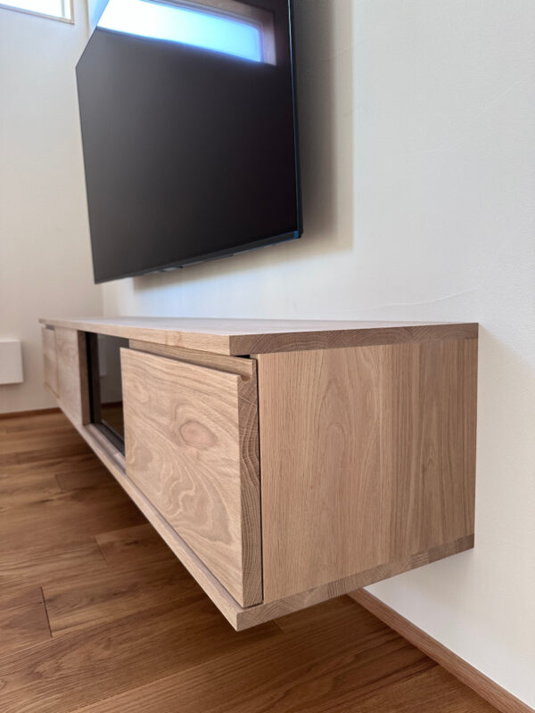 床から浮いたように設置されたTVボードは、ナラ無垢材の質感が美しい一台。