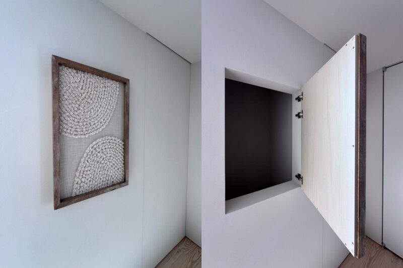 インテリアとして壁に飾られたアート作品のような扉。実は中が収納スペースになっています。